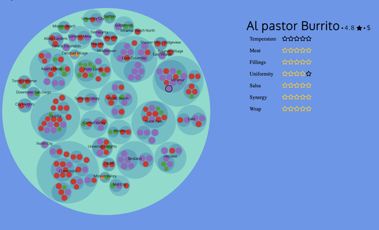 The project uses zoomable circle packing visualization below shows the burritos and their ratings in San Diego.